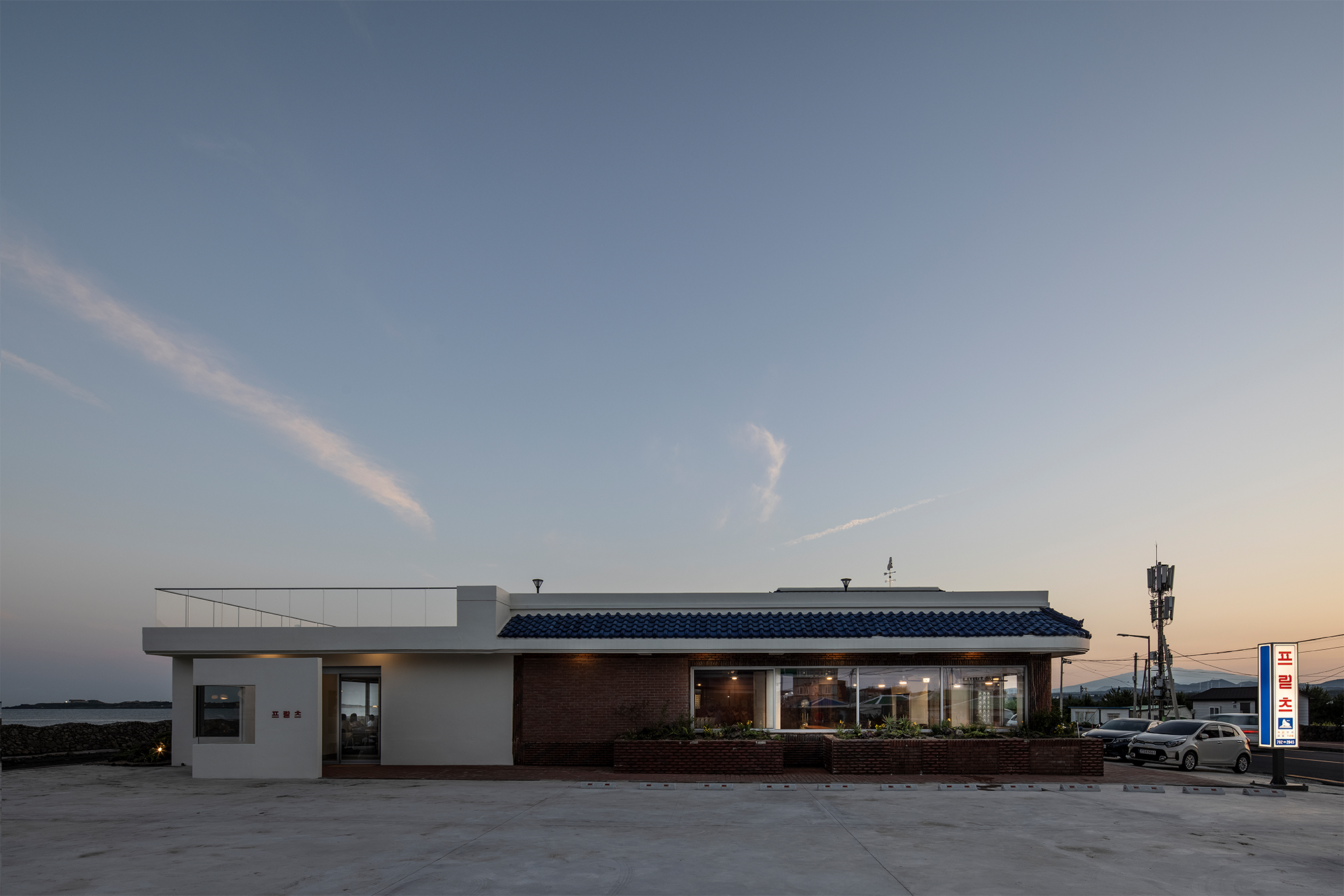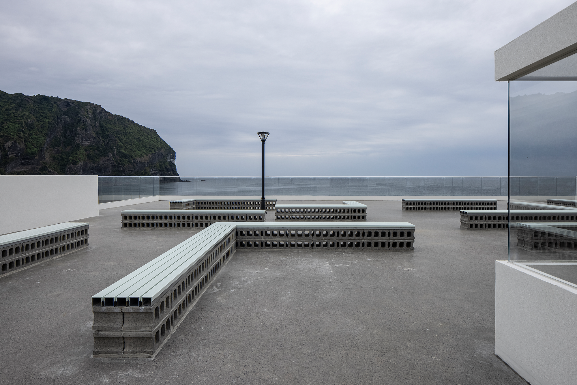 On the rooftop of Fritz, achromatic straight line in contrast to the sea and Seongsan Ilchulbong intersects in front of you. Although the geographical characteristics of the sea were not intuitively emphasized, variables caused by strong winds in front of the sea were used to add inevitable visual fun. The bench made of large holes of asphalt and hollow aluminum passes through strong sea winds, so the structure does not collapse, and it gives strength to the scenery in front of it rather than being the main character.