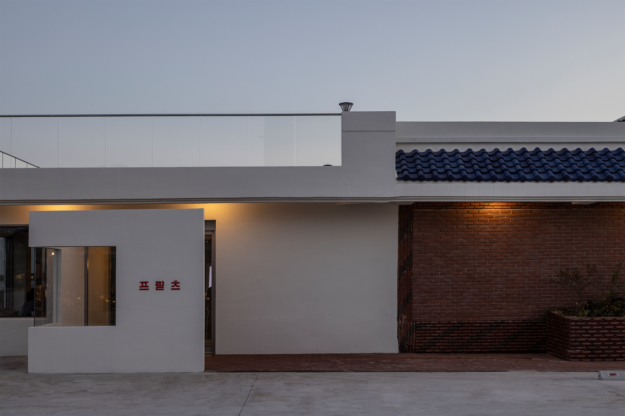 프릳츠의 옥상은 성산 일출봉, 바다와 대비되는 무채색의 차가운 직선이 교차한다. 바다라는 지리적 특성이 직관적으로 강조되지 않았지만, 바다앞의 거센 바람으로 인한 변수를 이용해 필연적인 시각적 재미를 더했다. 큰 구멍의 아스팔트와 속이 빈 알루미늄으로 제작한 벤치는 강한 해풍을 통과시켜 구조가 무너지지 않으며, 주인공이 되기 보다 눈앞의 풍경에 힘을 실어준다.