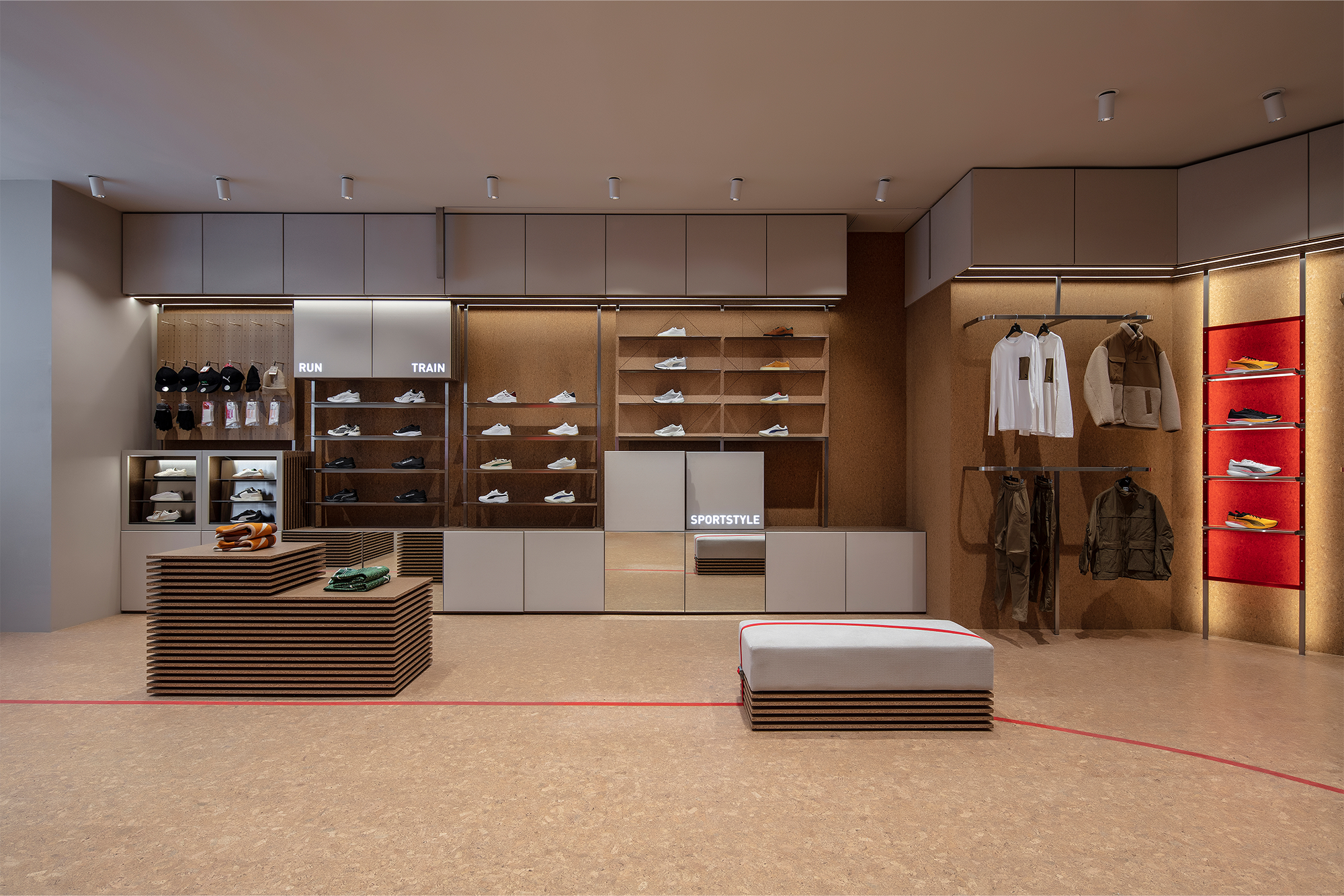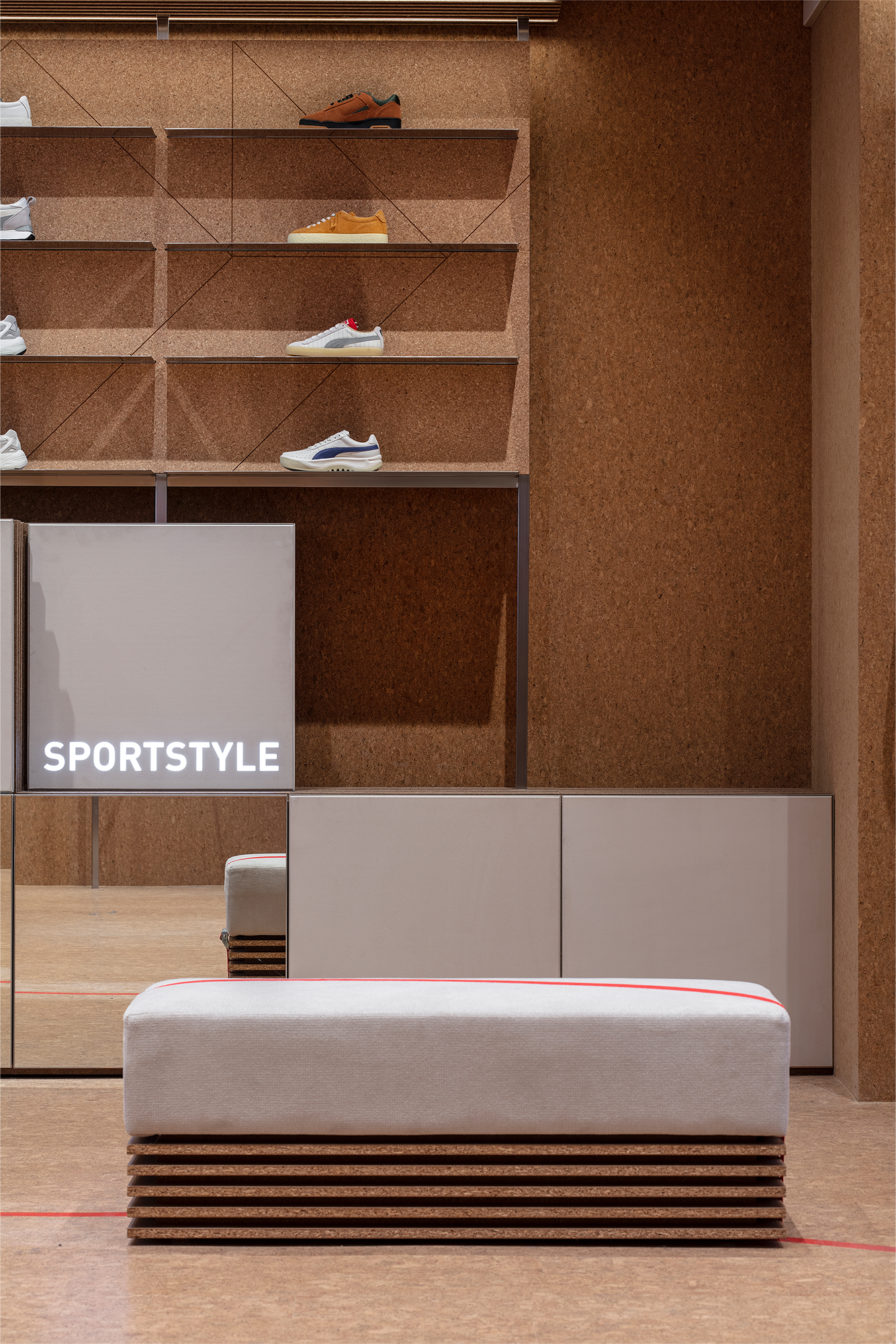 The module furniture, designed with layers, can be adaptable to different spatial configurations, including challenging areas like pillars and walls. It's worth noting that these furnishings are crafted from eco-friendly materials such as particleboard and cork, aligning with Puma's commitment to sustainable values and infusing warmth into the space.