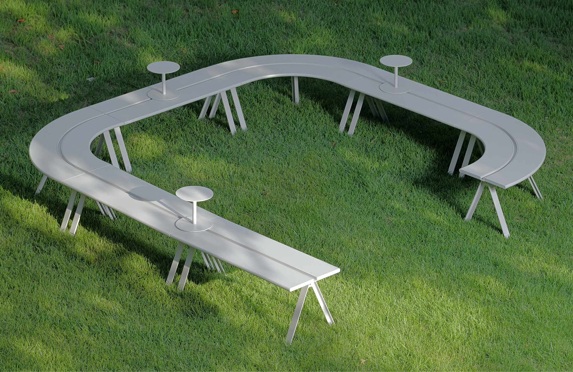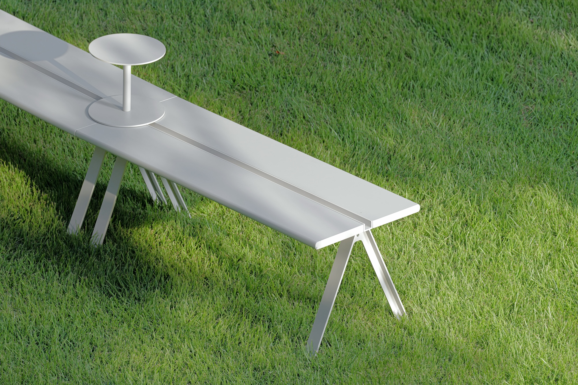 The Parvi Bench features a central line detail, designed to connect multiple units or incorporate side table accessories. By combining line and curve-shaped modules, it allows for various configurations, making it suitable for communal spaces like lounges.