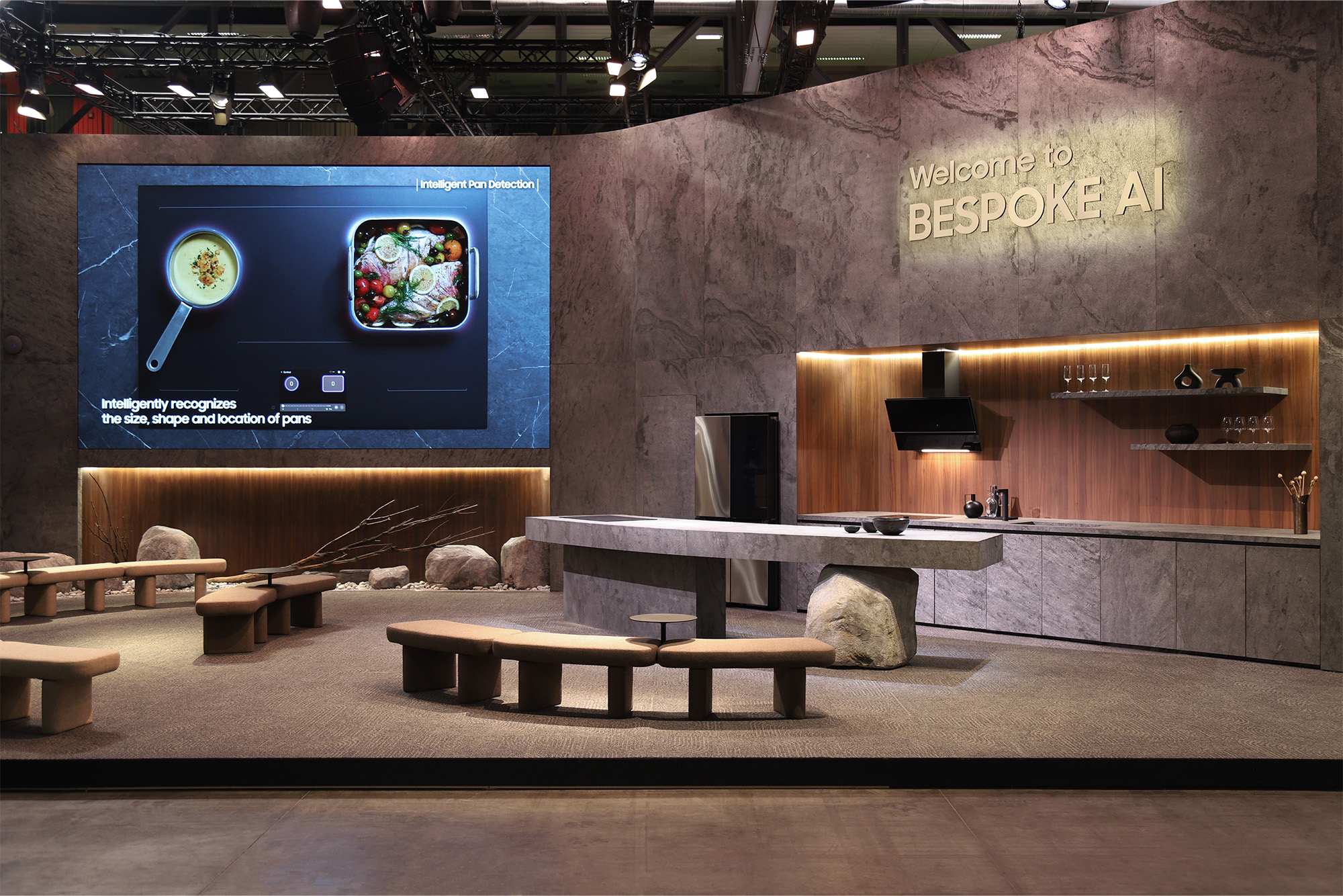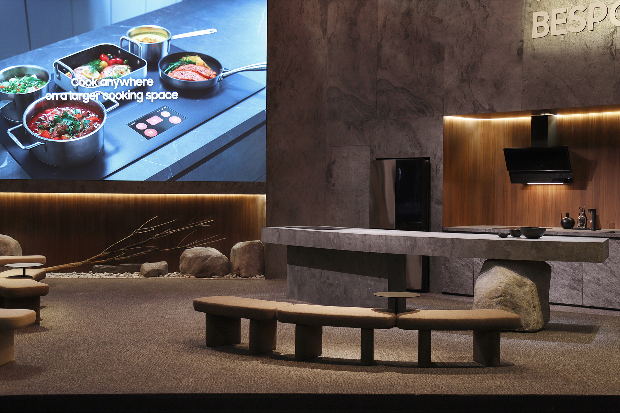 주방에서 조화로운 저녁시간을 보내는 각자의 모습을 상상할 수있는 동선, 쿠킹쇼를 감상하기 적합한 가구의 배치로 관람객들의 몰입을 돕는다.
