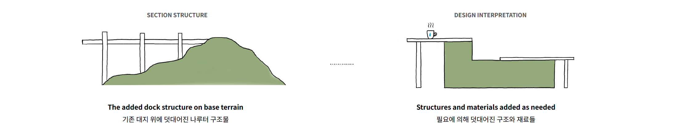 우리는 잠시 머물렀다 흩어지는 ‘나루터’의 구조와 형태에 주목했으며, 그 특징을 공간과 집기에 재해석하여 구성하고자 하였습니다. 기능에 따라 완성된 하나의 언어는, 각 요소들이 조화롭게 어우러지며 공간의 전반적인 흐름을 유기적으로 형성하도록 합니다.