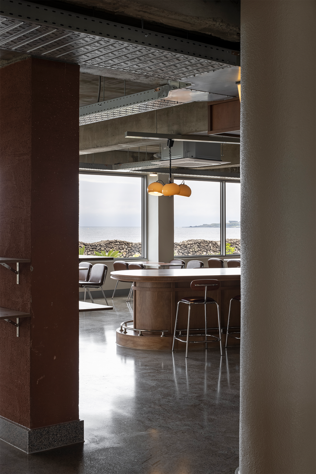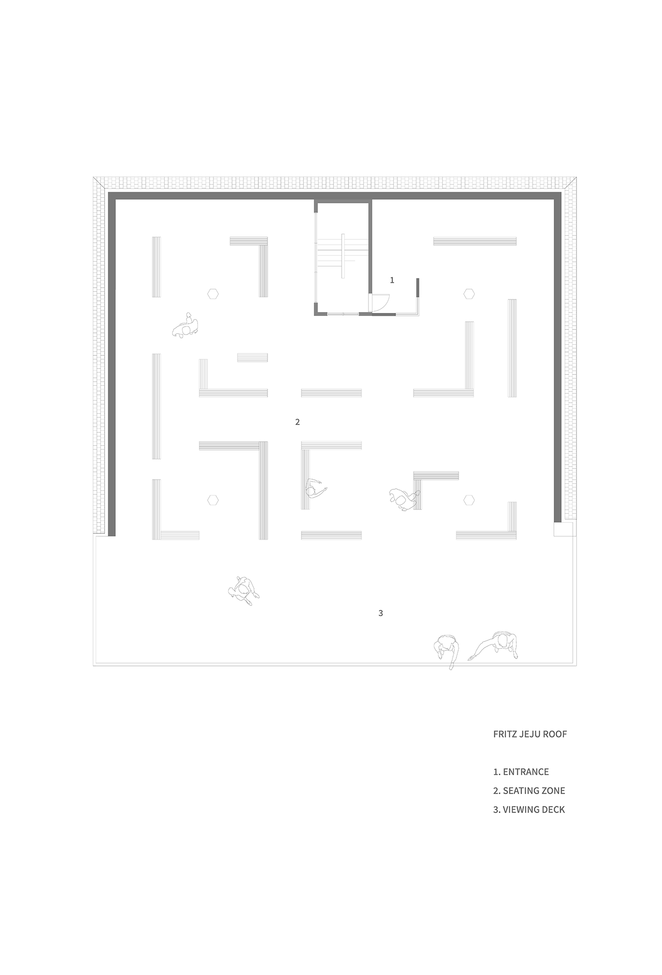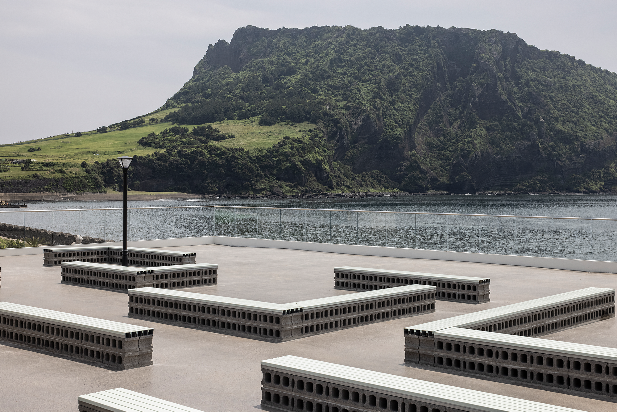 On the rooftop of Fritz, achromatic straight line in contrast to the sea and Seongsan Ilchulbong intersects in front of you. Although the geographical characteristics of the sea were not intuitively emphasized, variables caused by strong winds in front of the sea were used to add inevitable visual fun. The bench made of large holes of asphalt and hollow aluminum passes through strong sea winds, so the structure does not collapse, and it gives strength to the scenery in front of it rather than being the main character.