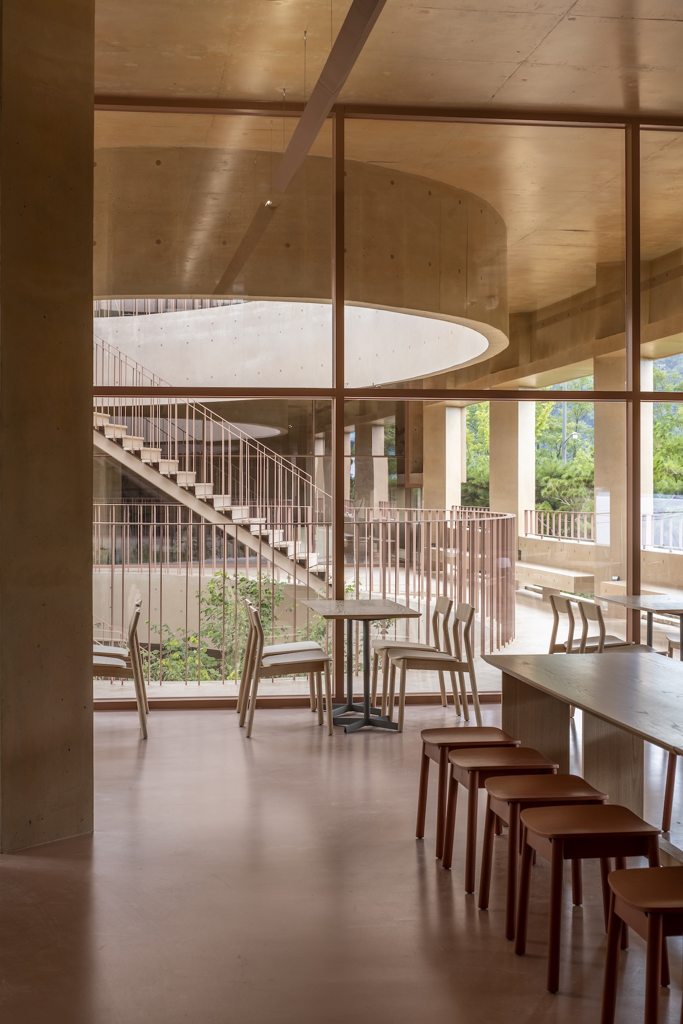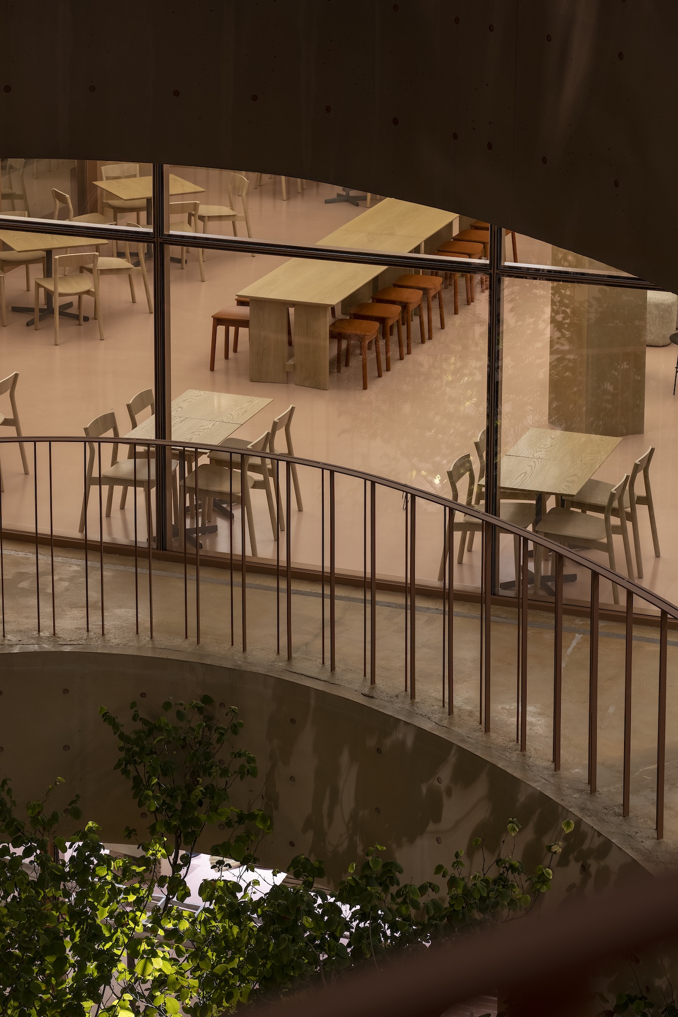 The furniture for the cafe incorporates varying heights to meet diverse customer needs and ensure a natural, smooth flow throughout the space. For the interior, materials inspired by the colors and textures of nature were used to harmonize with the outdoor landscaping and create a natural, unified atmosphere.