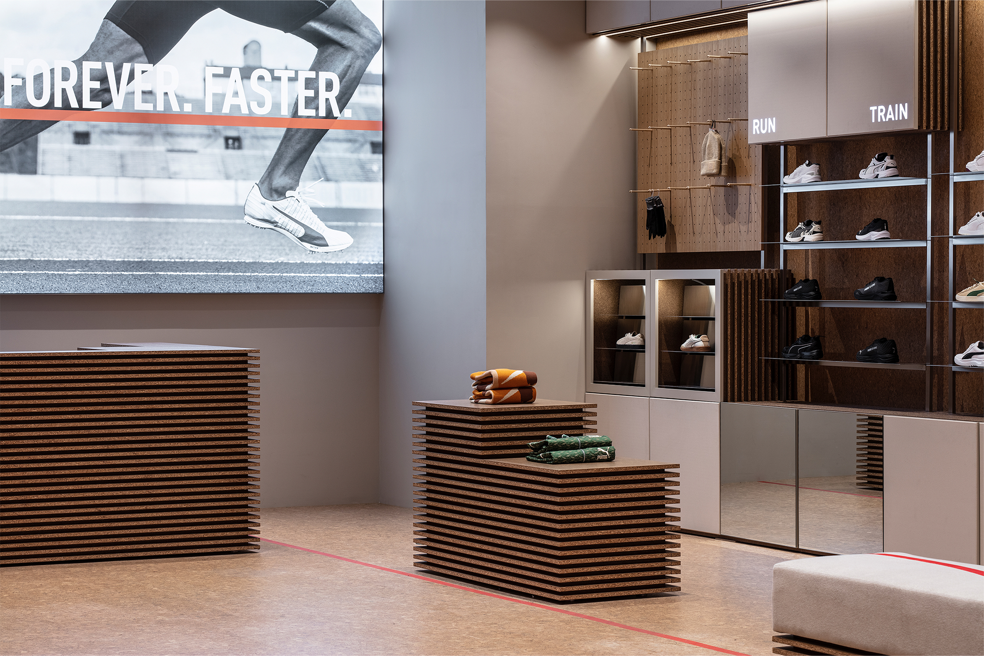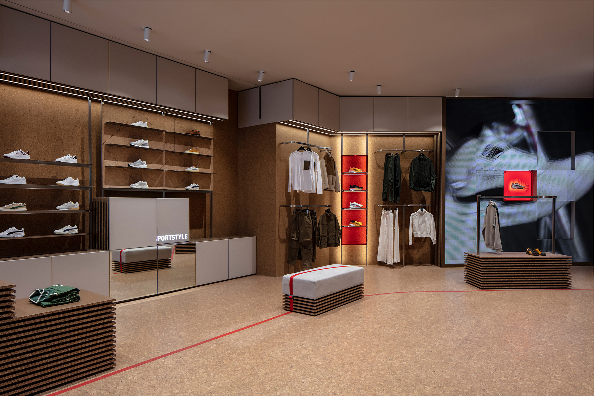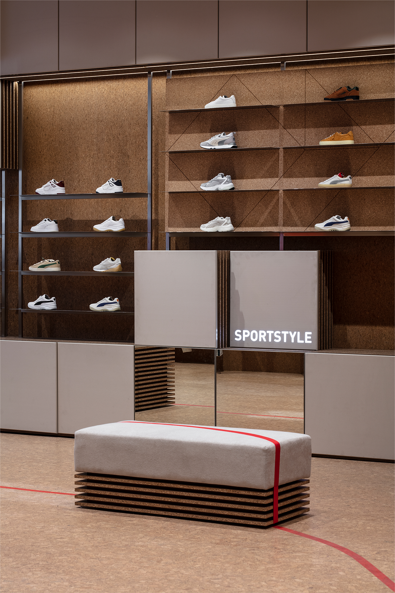 The module furniture, designed with layers, can be adaptable to different spatial configurations, including challenging areas like pillars and walls. It's worth noting that these furnishings are crafted from eco-friendly materials such as particleboard and cork, aligning with Puma's commitment to sustainable values and infusing warmth into the space.