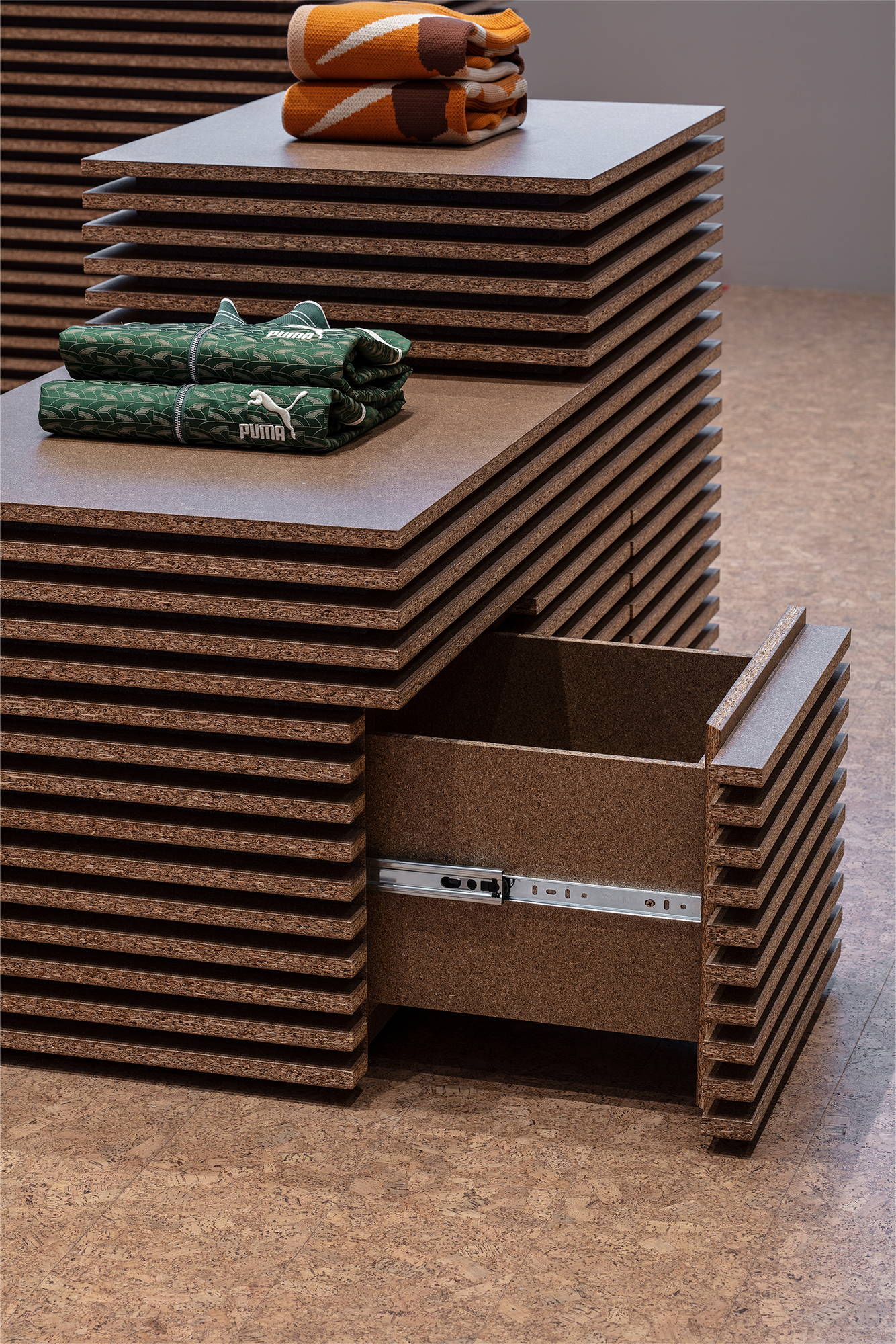 레이어를 활용한 모듈가구는 사용하기 어려운 기둥공간, 벽면을 포함한 여러 상황에서 조형적으로 공간의 효율성을 높이는 가구로 적용이 가능하다. 또한 지속 가능한 가치를 추구하는 푸마의 브랜드 비전을 보여주기위해 친환경 소재인 파티클보드와 코르크로 제작되어 공간에 온기를 더한다.
