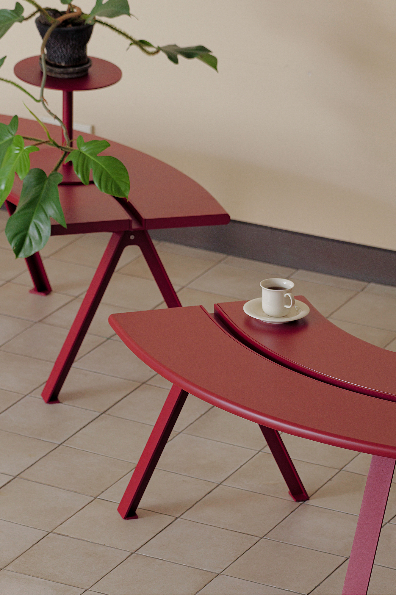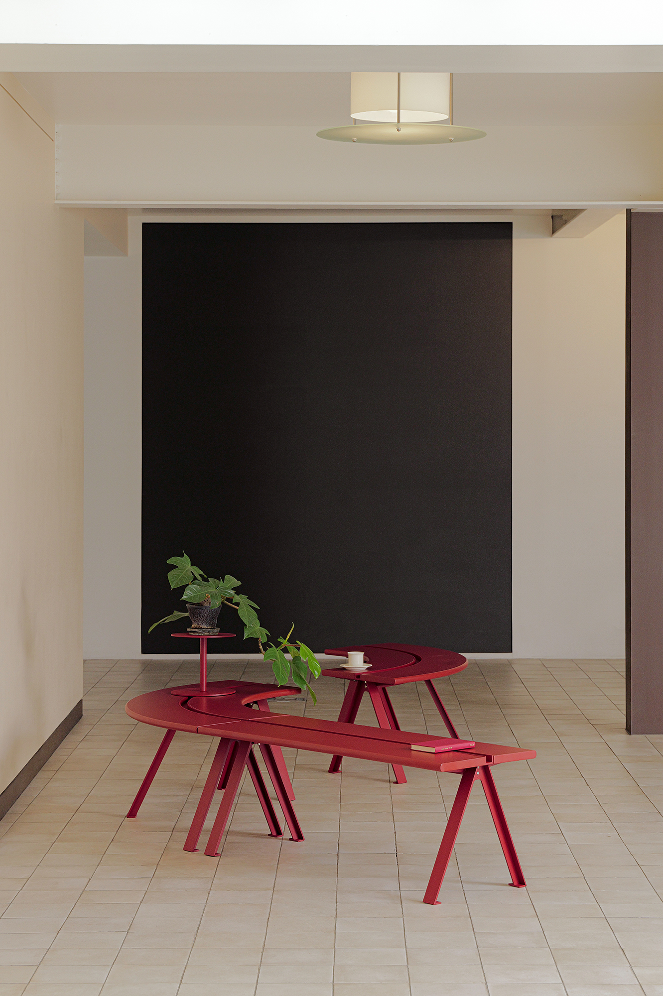 The Parvi Bench features a central line detail, designed to connect multiple units or incorporate side table accessories. By combining line and curve-shaped modules, it allows for various configurations, making it suitable for communal spaces like lounges.